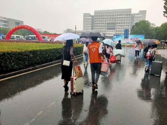 在学校各个门口、咨询服务点、各学院报到处、新生宿舍,随处可以看到我校迎新志愿者们忙碌的身影,他们为新生提供校园引导、报到咨询、行李运送、临时休息等新生服务。他们身上的志愿者服装、志愿者证件,如一面面高高飘扬的旗帜,指引着新生同学们。在各车站,志愿者们在出站口迎接着师弟师妹们;在校园路口,志愿者们撑着伞为新生指路,带领他们去迎新点办理报到手续;在迎新点,志愿者们帮助新生完成报到流程,帮助他们搬运行李,为他们提供便利。